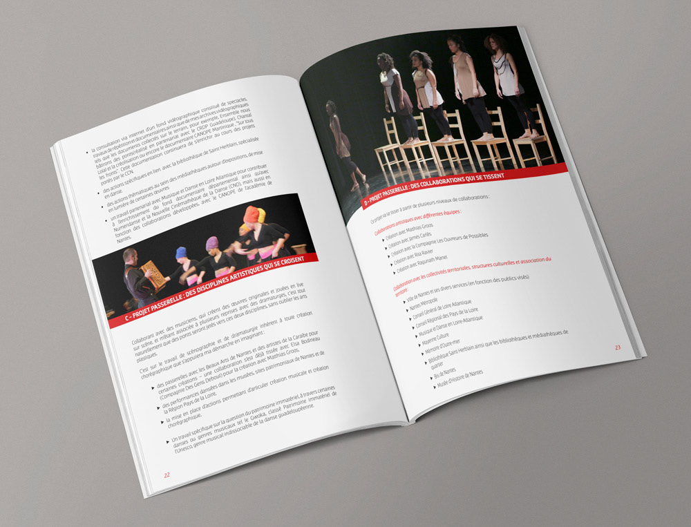Création de la maquette et mise en pages du dossier de candidature de la chorégraphe Chantal Loïal, à la direction du centre chorégraphique national de Nantes.